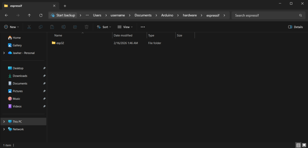 Think of the Arduino IDE as having two separate sections: one for the main app and one for your personal work. It keeps its own system files in one place and your custom projects and boards in another called the Sketchbook. This setup is great because it means when you update the software, your custom boards and projects won’t get deleted or messed up. Because of this, the IDE will only scan the Sketchbook folder for third-party boards like the ESP32. If the files aren’t in this exact location, the “ESP32” option simply won’t appear in your menu.