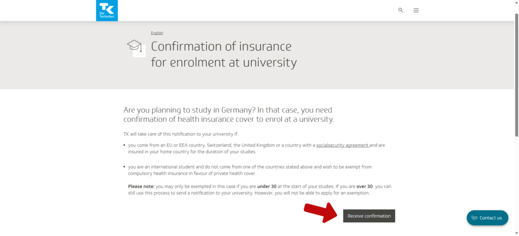 you will see the page titled “Confirmation of insurance for enrolment at university.” On this page, press the button “Receive confirmation.” This will start the online form where you can apply for exemption